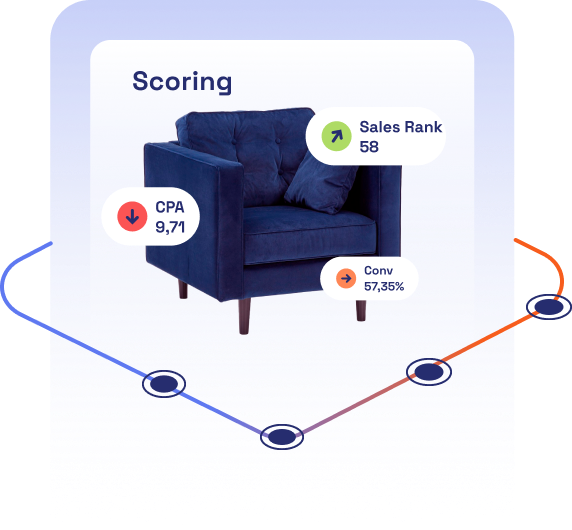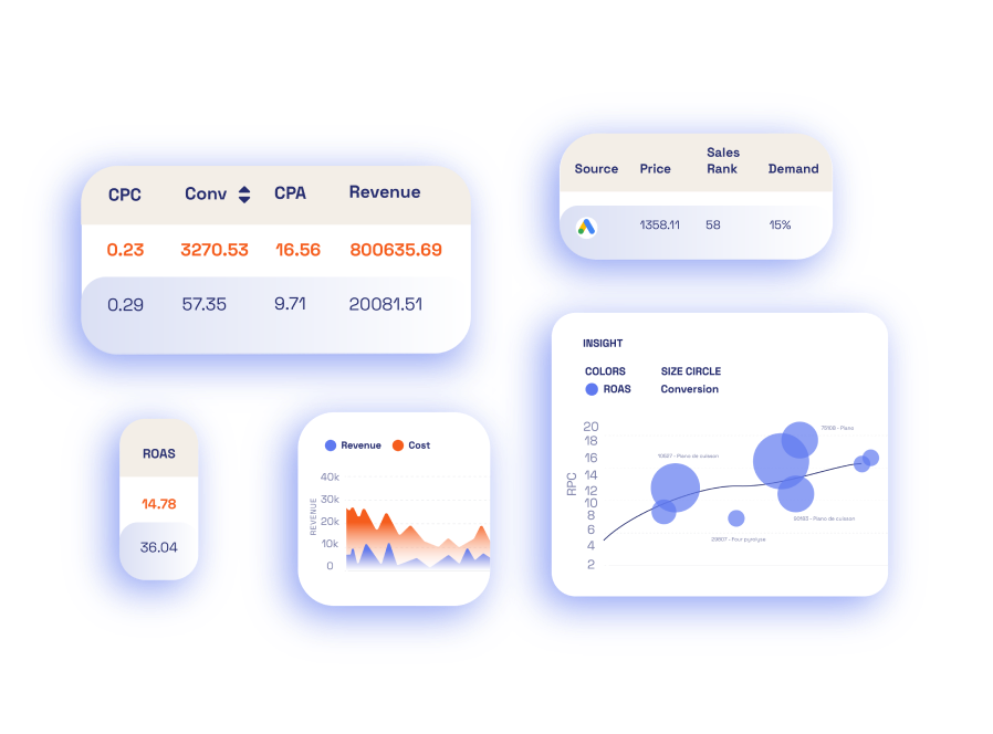Notre technologie collecte, transforme et valorise chaque jour +100 champs d’analyse par produit : niveau de demande, potentiel par canal d’acquisition, concurrence prix, saisonnalité, coûts par clic, etc…